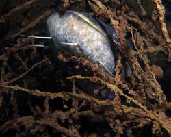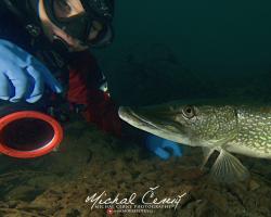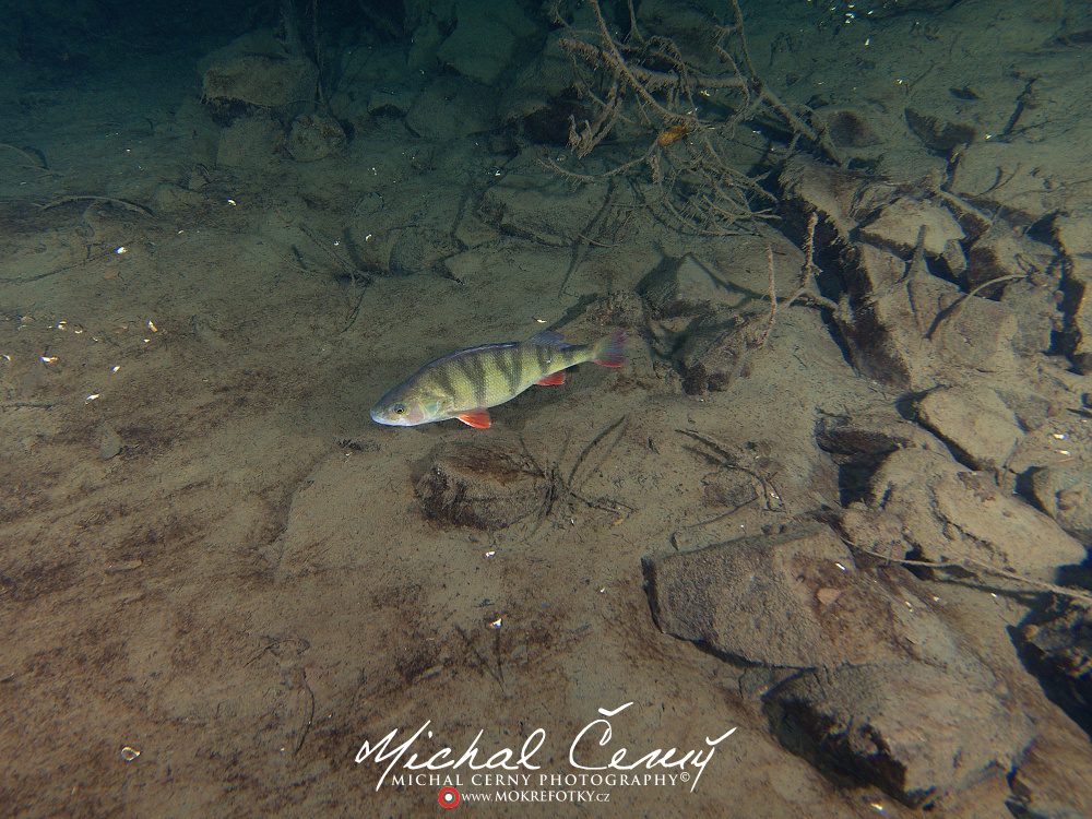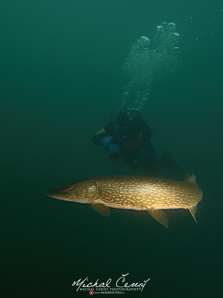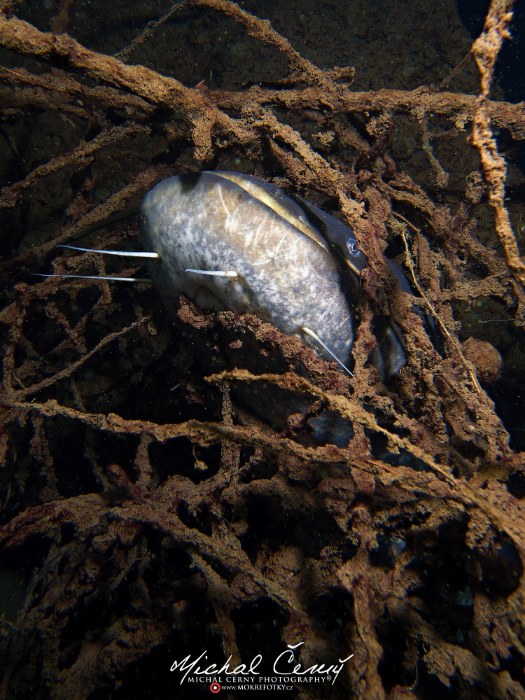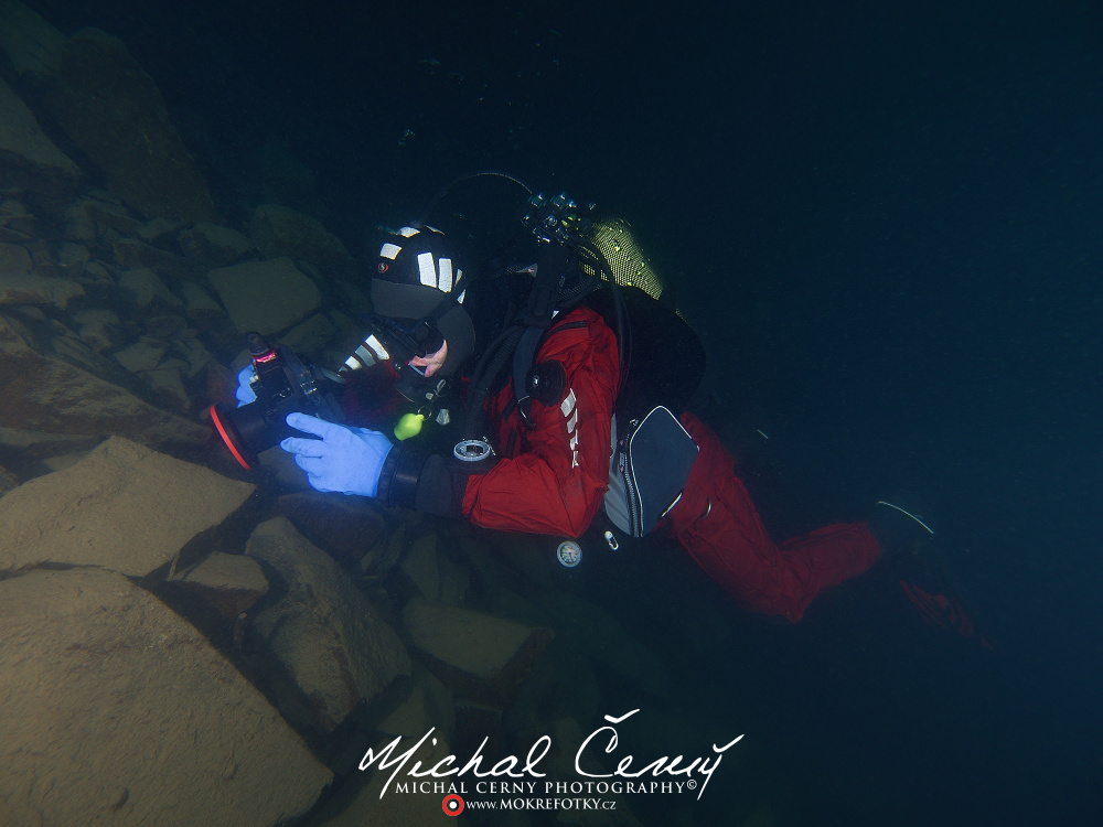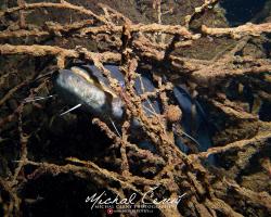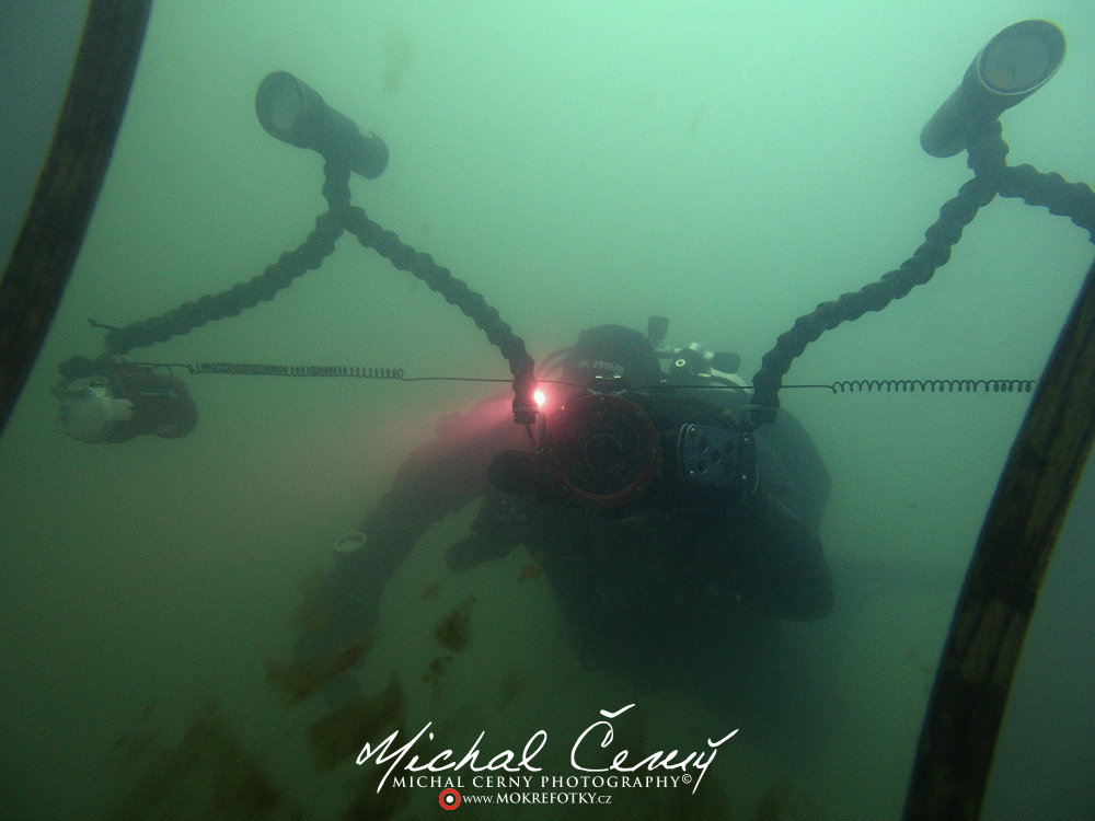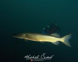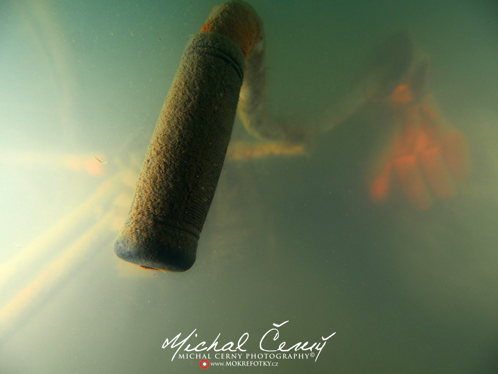 Bereme to od brány ke kajtenu a pak chceme k Varťasu. Nahoře je vidět fakt slušně, odhaduji to tak okolo 10-ti metrů, ale ve vodě je spousta částic, které komplikují focení. Cestou dolu na plato se to pod 15ti metry začíná rapidně zhoršovat a od 18ti metrů není vidět skoro nic. Což je krásně poznat z fotky jízdního kola, do kterého jsem jen náhodou narazil. Vystoupáváme tedy malinko výše a po chvíli připlouváme ke Stejskalníku, ten je vidět od horní poloviny, spodek je v neviditelnosti. Bereme to tedy do lesa, kde potkáváme asi pět velkých štik a nakonec i sumce schovaného ve větvích. Fotky se mi ale tentokrát nějak nepovedly, prostě mi to dneska nefotilo.