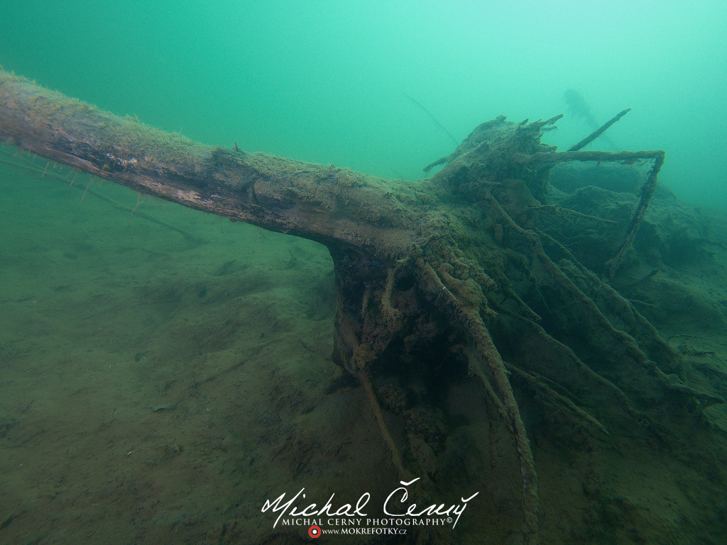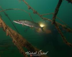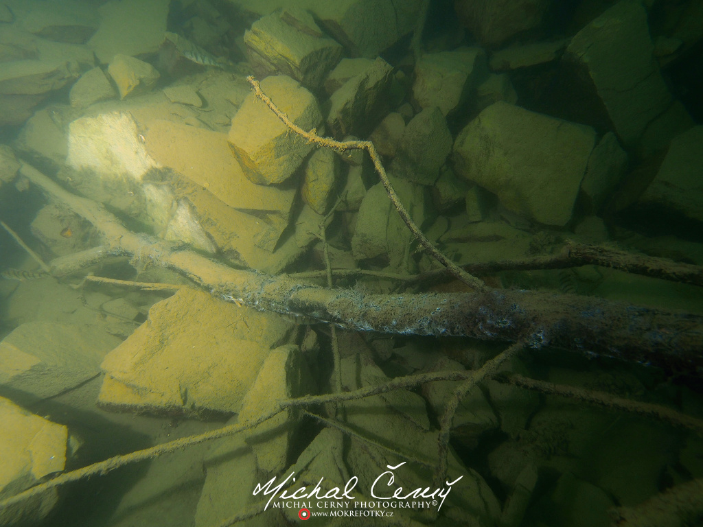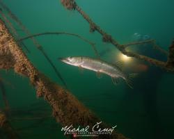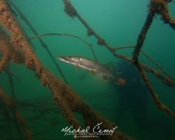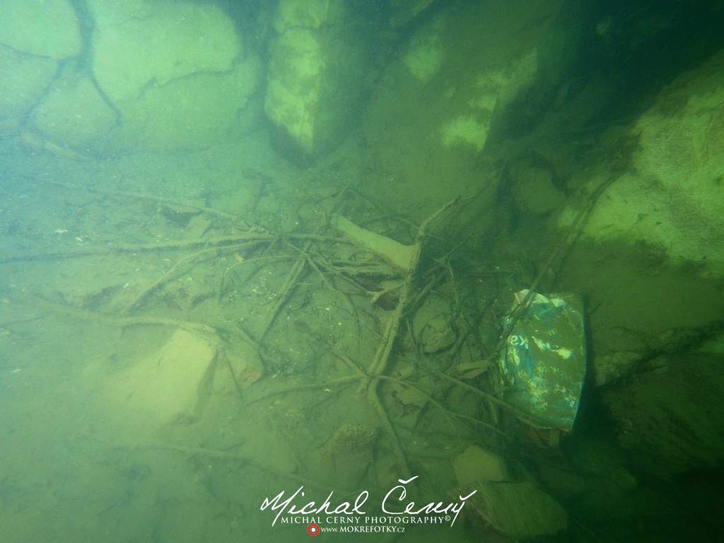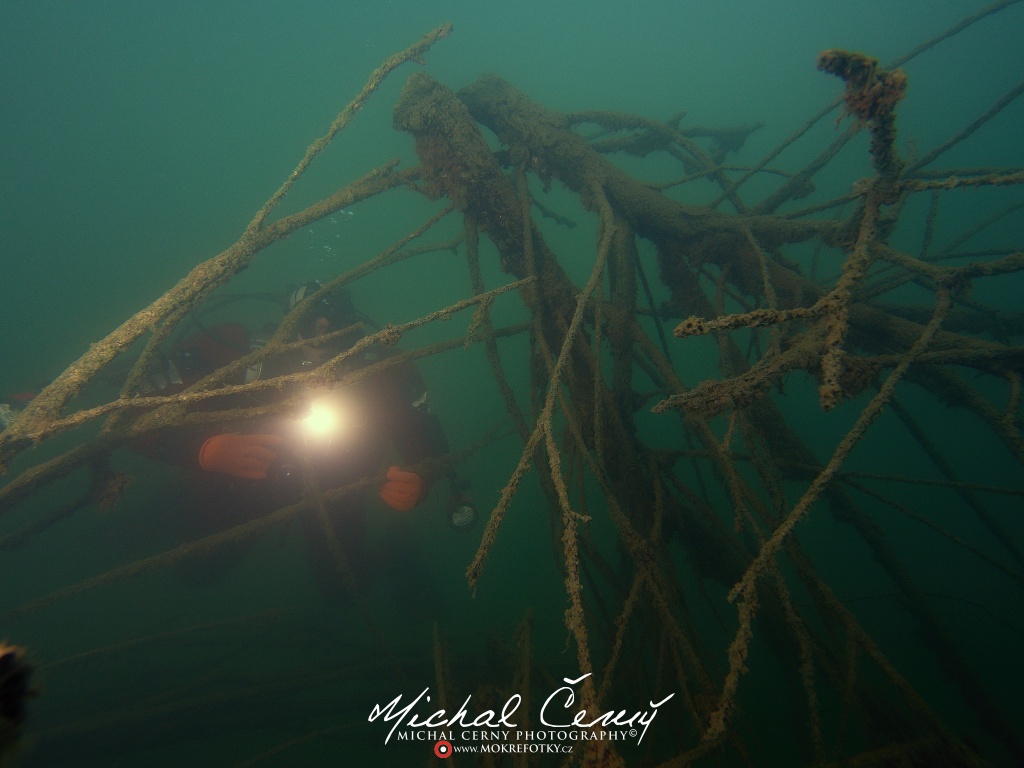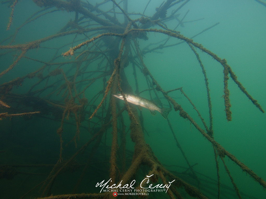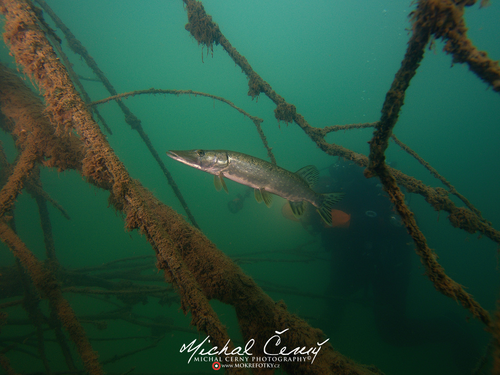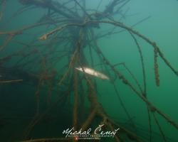 I po zanoření to vypadá hodně dobře, odhaduji to tak na 4 metry, ale v hloubce osmi metrů se to prudce zhoršuje a dál není vidět skoro nic. V téhle viditelnosti tak na nataženou ruku se nám bohužel bagry najít nepodařilo. Vracíme se tedy do menší hloubky a narážíme na několik stromů. V jednom z nich je zaparkovaná pěkná štika, ale na focení moc nemá náladu a poměrně rychle mizí. Kousek dál ve stěně nacházíme nainstalovanou koloběžku, za kterou to otáčíme zpět. Na bagry se sem tedy budeme muset vydat někdy příště.
