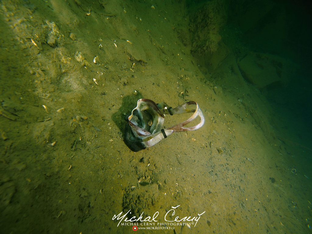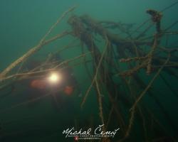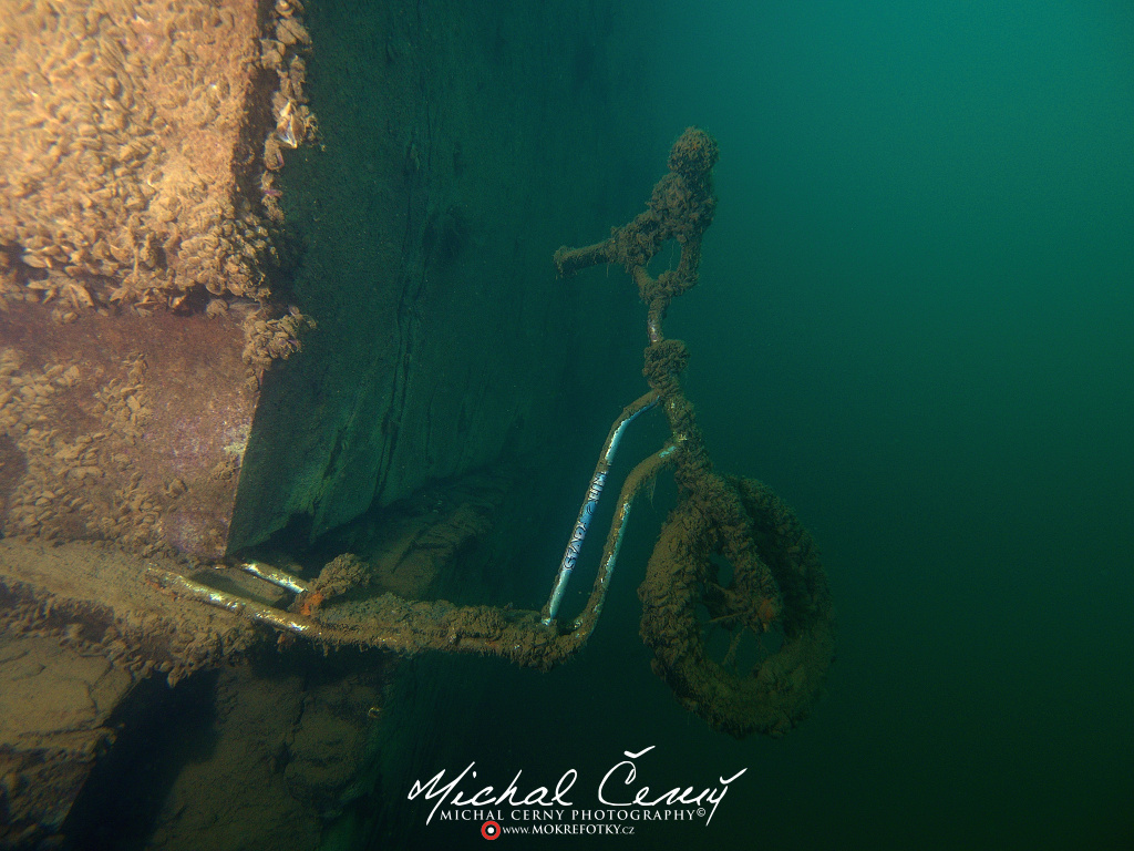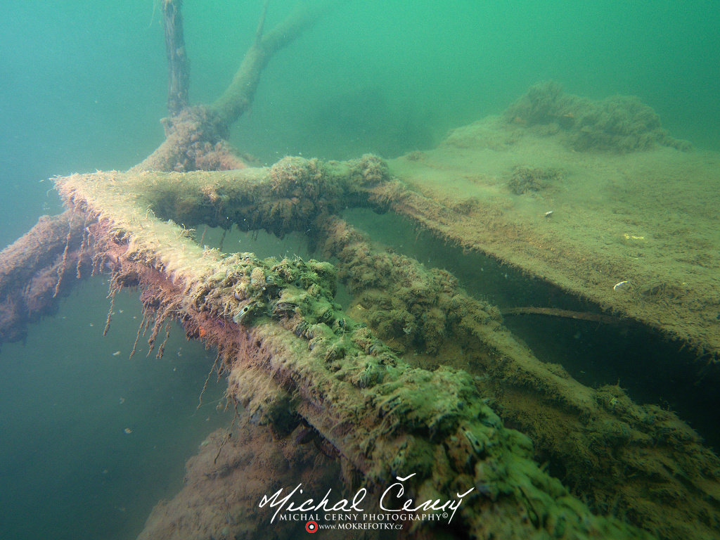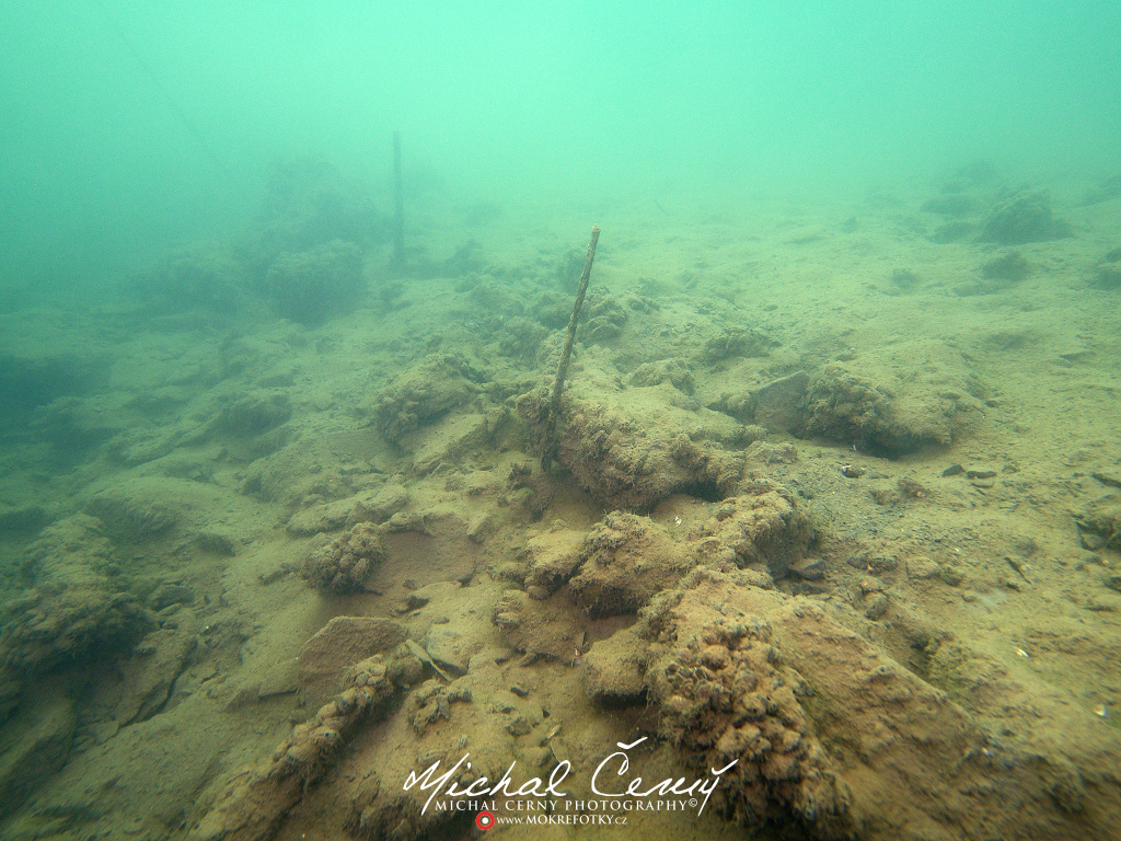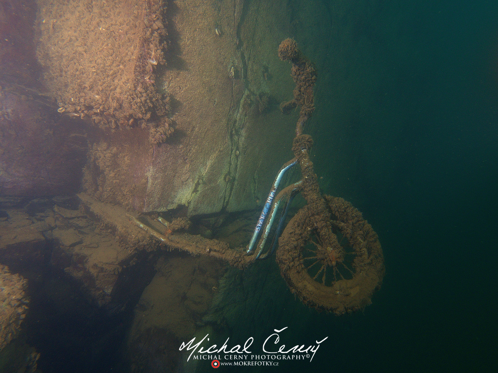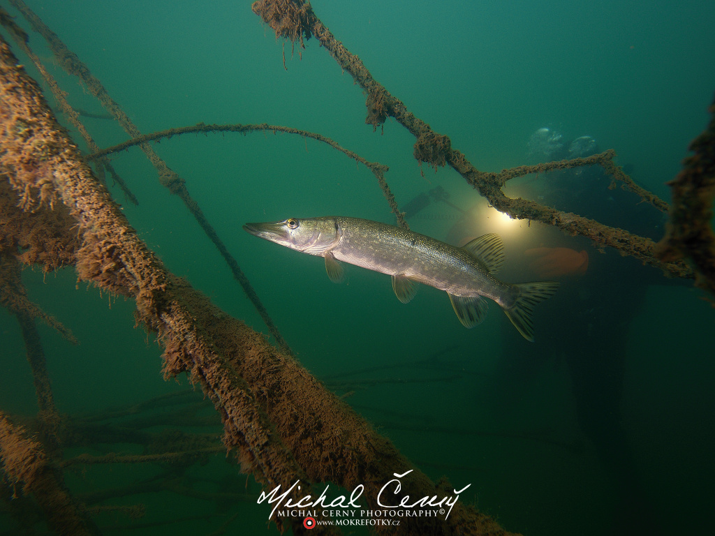 I po zanoření to vypadá hodně dobře, odhaduji to tak na 4 metry, ale v hloubce osmi metrů se to prudce zhoršuje a dál není vidět skoro nic. V téhle viditelnosti tak na nataženou ruku se nám bohužel bagry najít nepodařilo. Vracíme se tedy do menší hloubky a narážíme na několik stromů. V jednom z nich je zaparkovaná pěkná štika, ale na focení moc nemá náladu a poměrně rychle mizí. Kousek dál ve stěně nacházíme nainstalovanou koloběžku, za kterou to otáčíme zpět. Na bagry se sem tedy budeme muset vydat někdy příště.