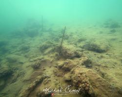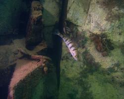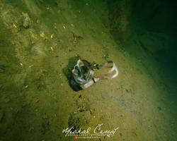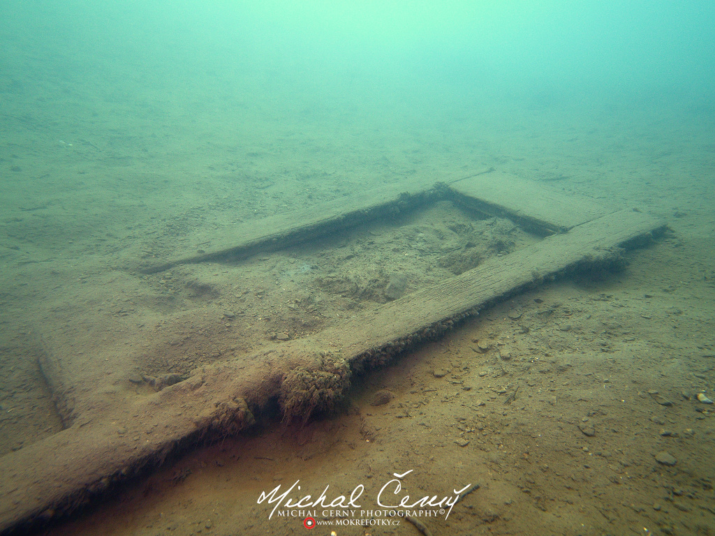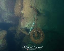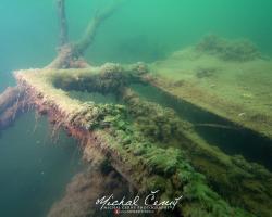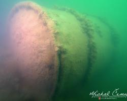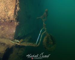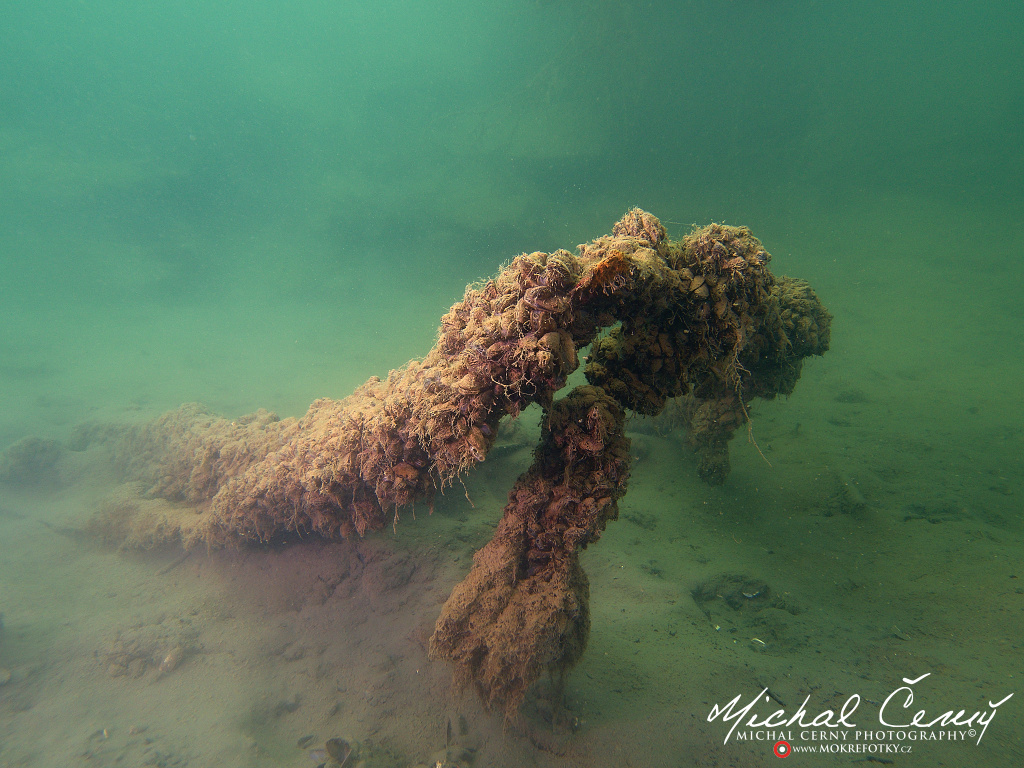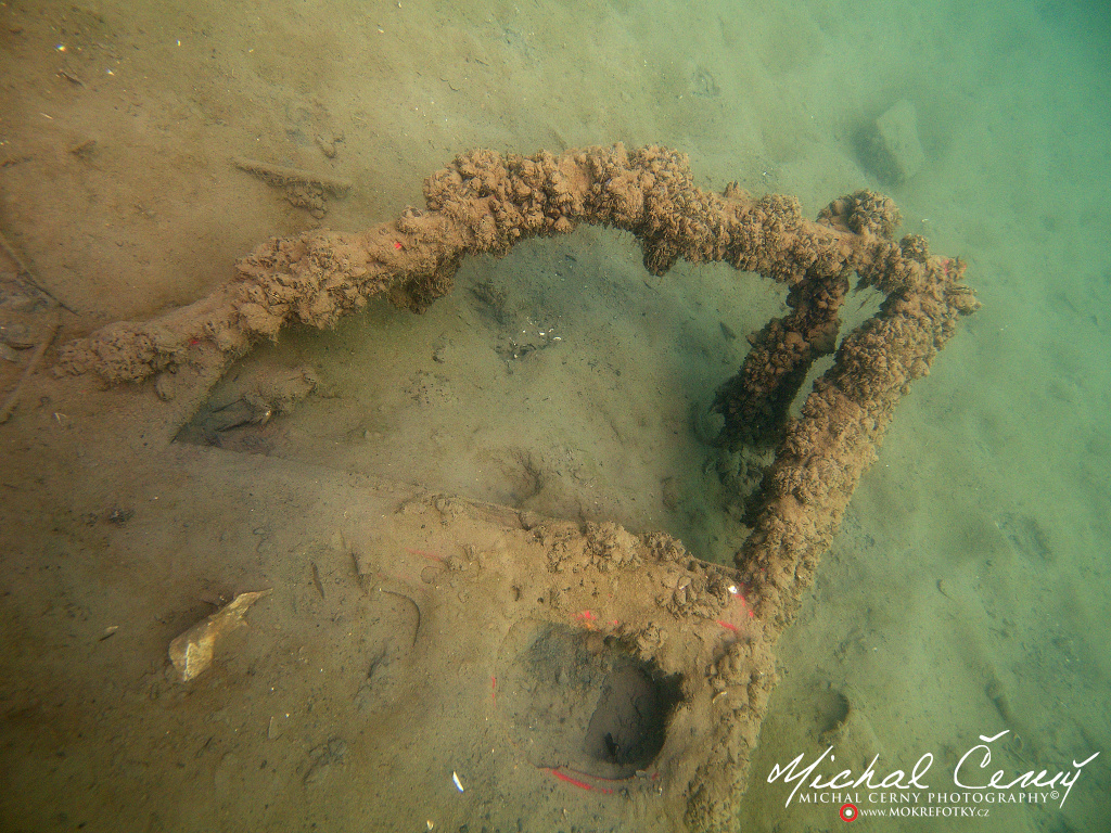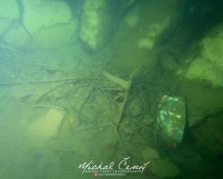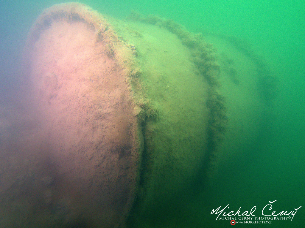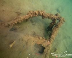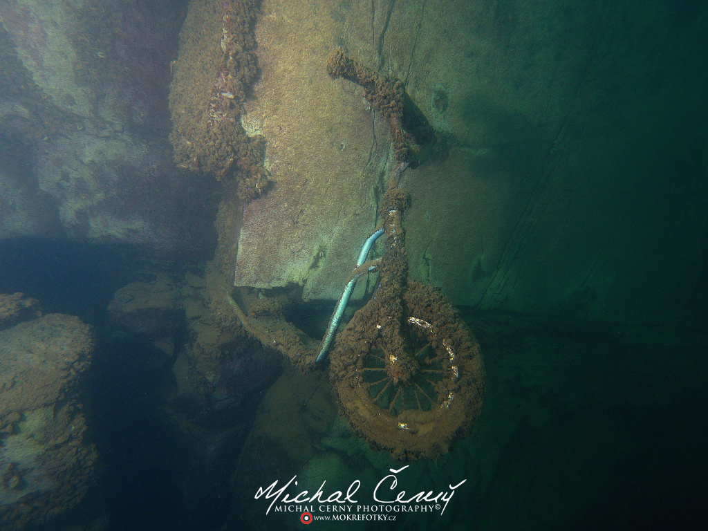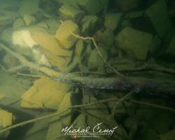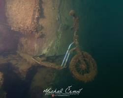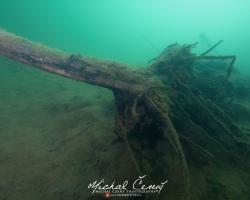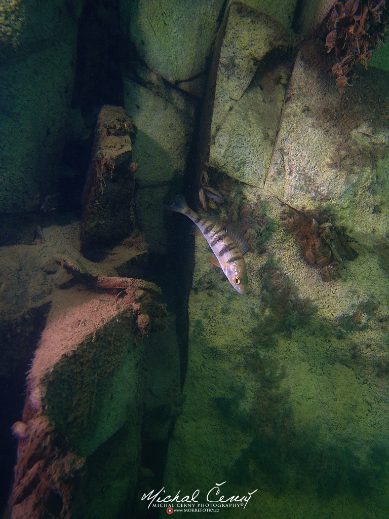 I po zanoření to vypadá hodně dobře, odhaduji to tak na 4 metry, ale v hloubce osmi metrů se to prudce zhoršuje a dál není vidět skoro nic. V téhle viditelnosti tak na nataženou ruku se nám bohužel bagry najít nepodařilo. Vracíme se tedy do menší hloubky a narážíme na několik stromů. V jednom z nich je zaparkovaná pěkná štika, ale na focení moc nemá náladu a poměrně rychle mizí. Kousek dál ve stěně nacházíme nainstalovanou koloběžku, za kterou to otáčíme zpět. Na bagry se sem tedy budeme muset vydat někdy příště.
